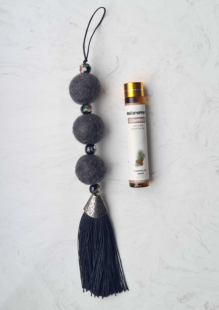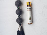 SALE! Länge c. 24 cm, Quastkappe aus Tibetsilber (Legierung), ergänzt mit schwarzen Emailleperlen mit aufgesetztem Blumenmuster. Dazu gehört ein Fläschchen mit ätherischem Zedernholzduftöl (10 ml).