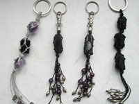 Version 2 (Bild 2. von links): ca. 20 cm lang. Der schwarze Turmalin ist 3,5 cm lang. Die Amethystperlen sind 8 mm groß. Metallring ca. 2 cm Durchmesser, mit Karabiner.